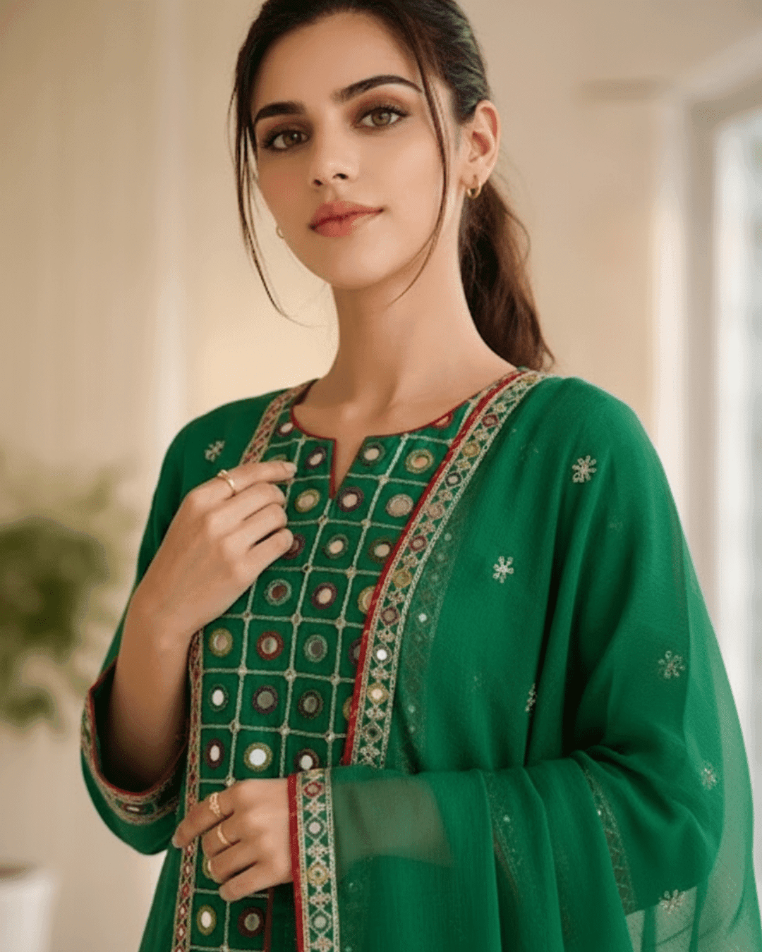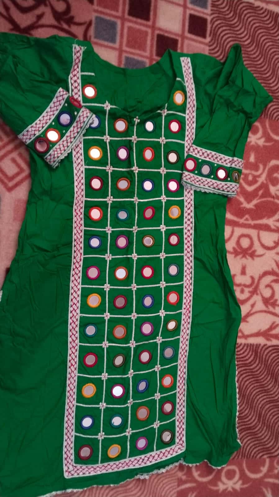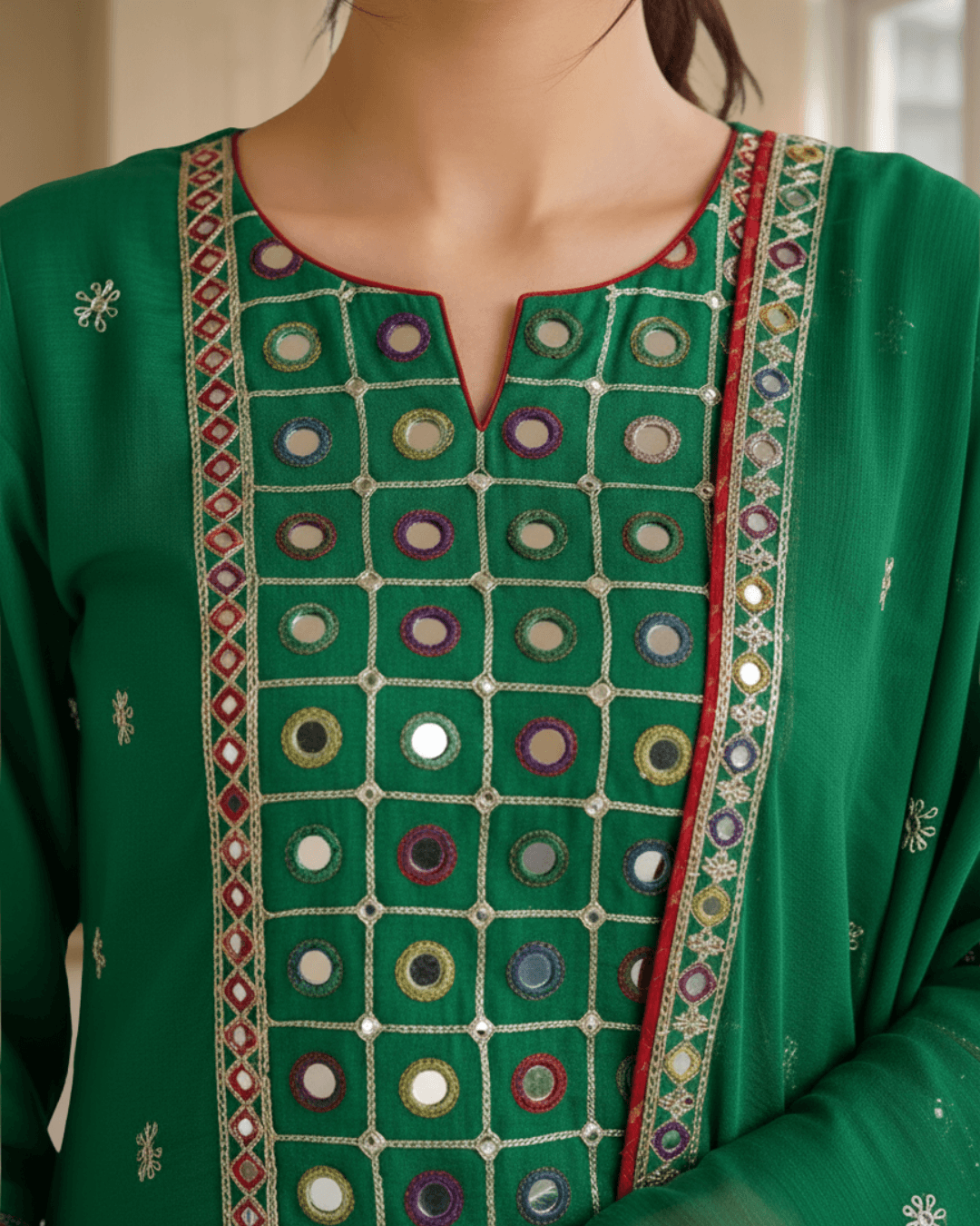Sleeves: Quarter-length sleeves adorned with a matching embroidered border and mirror detailing.