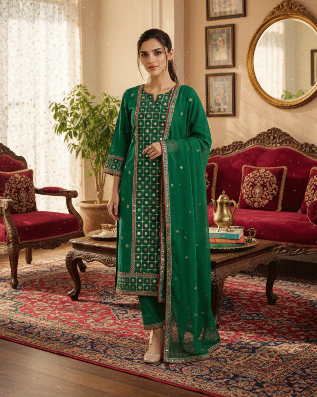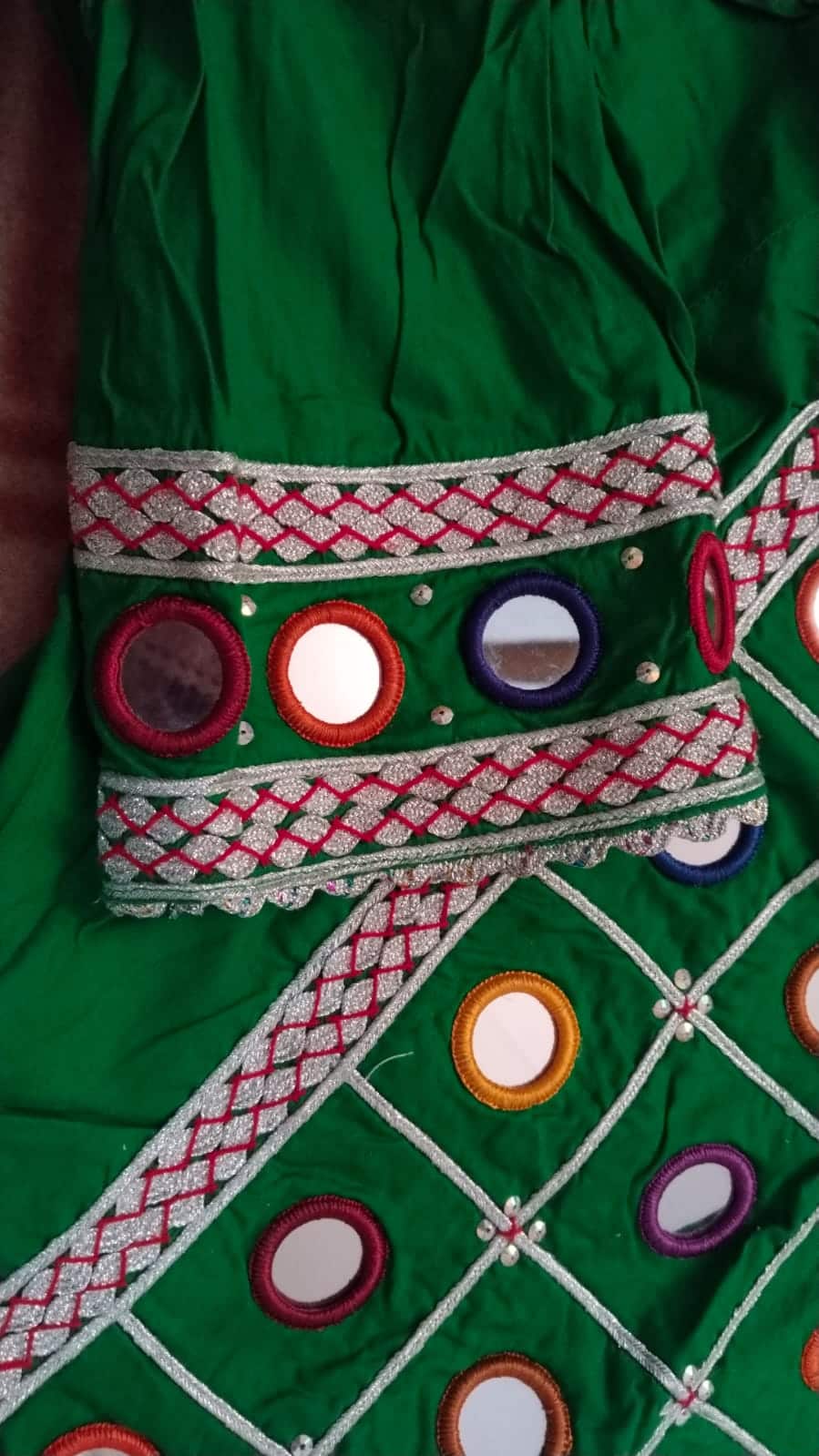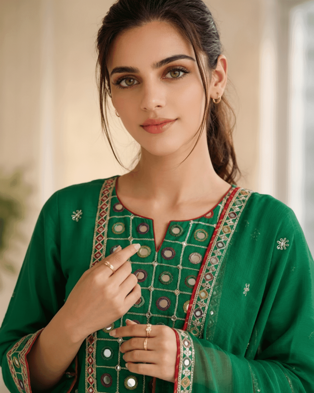 Sleeves: Quarter-length sleeves adorned with a matching embroidered border and mirror detailing.
